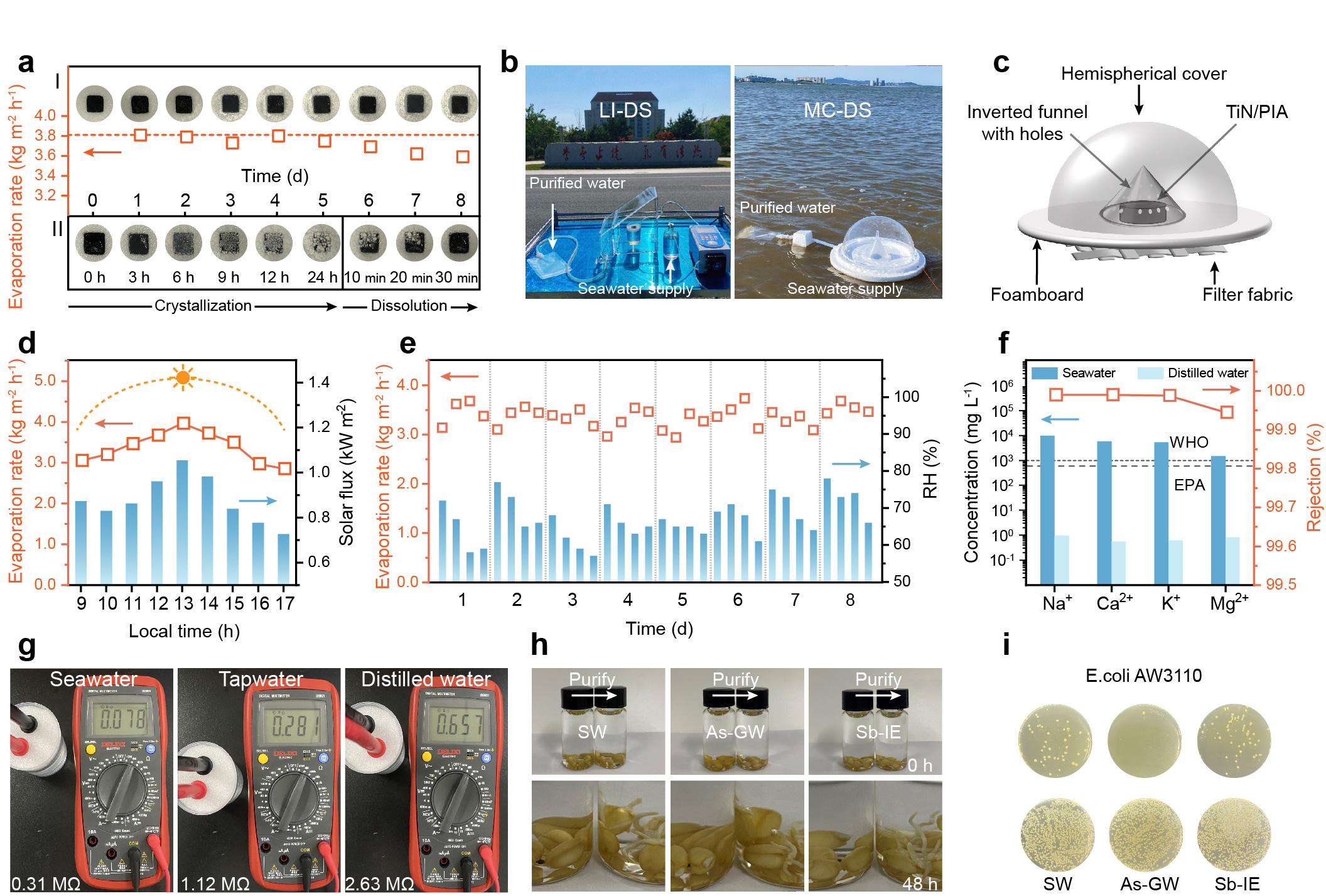 在山东大学青岛校区使用黄海海水进行的户外实验表明,蒸发率稳定在2.96 kg m-2h-1以上,主要离子浓度降低3-4个数量级,符合WHO和EPA的饮用水标准。此外,该蒸发器成功净化了含砷和锑的废水,净化水对小麦种子发芽和E. coli生长均未表现出明显的抑制作用。在户外太阳光照射下,该系统在真实海水和废水中连续运行8天无明显性能衰减,展现出其优异的实用性和抗盐耐污能力。所开发的陆海两用蒸发净水装置(已申请中国发明专利)轻质便携,可漂浮在海面上,实现太阳能自驱动海水淡化及废水净化,可适用于淡水缺乏的海岛、轮船等离网、应急或基础设施有限的场景。优异的耐盐特性亦使其在高盐工业废水处理领域具有较大潜力。本研究合成了表面等离子体共振(SPR)增强的光热气凝胶蒸发器,为高效、抗盐的太阳能废水净化及海水淡化提供了新的解决方案。