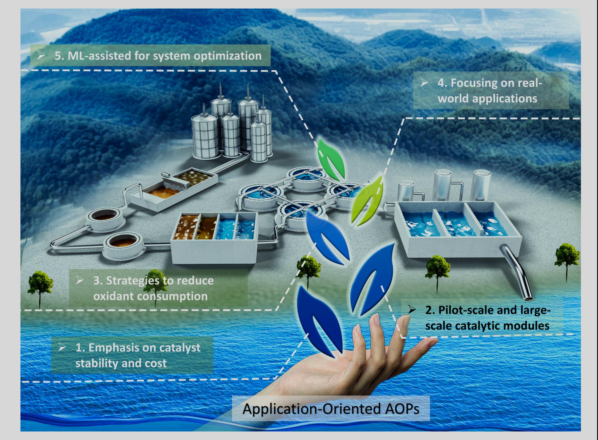 基于非均相催化原理的高级氧化技术(AOPs)已成为环境工程领域的研究热点。然而当前大多数研究仍聚焦于催化材料的精准设计、特定活性氧物种(ROS)及反应路径的机理探究。尽管这些材料、化学研究和探索具有重要科学价值,但可能并未充分解决AOPs技术实际应用的核心瓶颈。因此,亟需从应用导向视角厘清推进AOPs研究的科学挑战与工程难题,重点关注以下关键方向:(i)改变以单一提升本征活性为目标的研究范式,强化催化材料的稳定性与成本效益协同优化;(ii)开发面向中试及实际规模的催化模块,评估其长期运行效能;(iii)构建化学品减量投加策略,抑制处理过程中的二次污染风险;(iv)建立复杂真实污染场景的评估体系;(v)突破现有理论框架桎梏,可借助前沿机器学习技术,实现材料筛选—性能评估—系统优化的全链条智能化,在降低运营成本的同时提升系统能效。