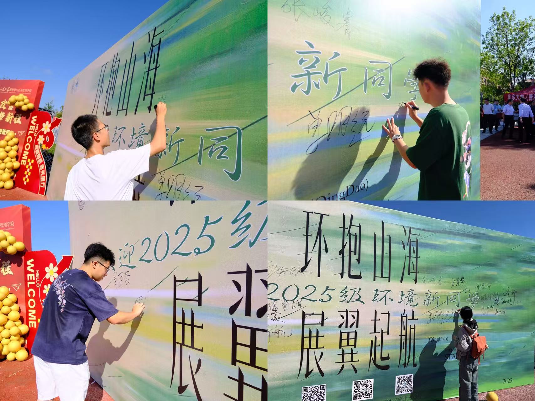 学院坚持以“环抱山海,展翼启航”为理念,系统开展迎新预热工作。迎新现场,以青绿色为主视觉的签名板成为合影热点,生动传递了环保理念与学科特色。
