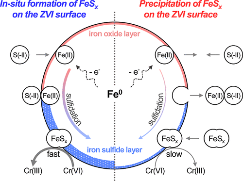硫化物修饰零价铁(SZVI)能够增强ZVI去除污染物的能力,构建ZVI与FeSx两相的界面连接是制备SZVI的关键。液相沉淀法制备SZVI过程中ZVI与FeSx的化学连接机制尚不清晰。基于此,课题组剖析SZVI制备过程,重点研究“原位生长”和“物理包覆”两种方式制备SZVI的性能。该研究揭示在 ZVI 表面原位形成FeSx能够实现两相的化学连接从而实现高效硫化。该途径主要受Fe(II)产生和FeSx析出两个步骤控制,通过调节pH和S(-II)浓度来平衡两个步骤的速率,实现了制备过程中对SZVI的良好控制。