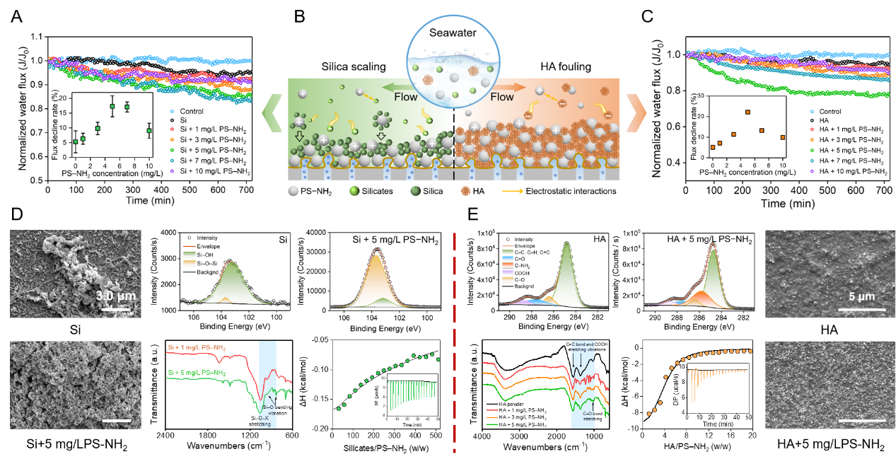 团队还探究了近海水域不断增加的纳米塑料(NPs)对海水淡化过程中RO膜性能的影响。揭示了纳米塑料的表面电位是决定RO膜污染倾向的关键因素,并从热力学角度阐明了静电、氢键、疏水相互作用和范德华力对于RO膜复合污染形成的影响,为RO海水淡化工程中新污染物的防控提供了理论基础。