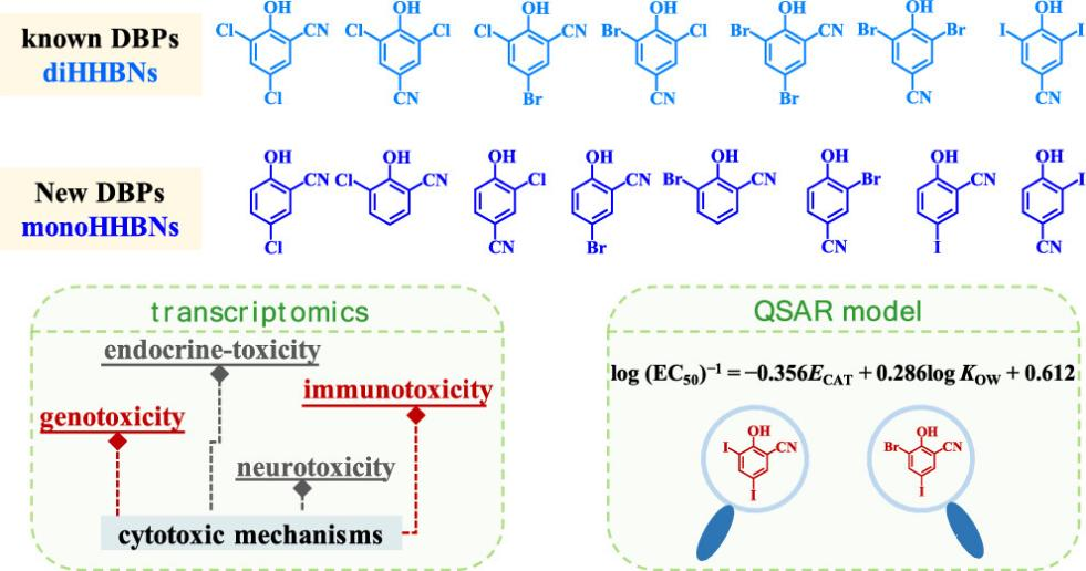 此外,团队在饮用水中检测并鉴定出八种新型一卤代羟基苯甲腈类消毒副产物,并对其毒性效应与机制进行了科学解析。结果表明,新型一卤代羟基苯甲腈在饮用水中的浓度为0.04-1.83 ng/L,其细胞毒性高于多种已知一卤代芳香族消毒副产物。转录组分析表明,一卤代羟基苯甲腈对CHO-K1细胞的主要致毒机制为免疫毒性和遗传毒性,并具有一定的致癌潜力。定量结构-活性关系模型表明,氧化应激和细胞摄取效率是影响其细胞毒性的重要因素,并凸显了饮用水中潜在的碘代羟基苯甲腈(如3,5-二碘-2-羟基苯甲腈)在未来研究中的重要性。上述发现对于更好地理解芳香族消毒副产物在饮用水中的健康风险具有重要意义。