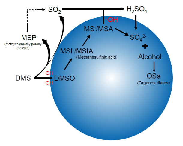有机硫酸酯(OS)是海洋气溶胶中的重要有机组分,在大气氧化能力、云凝结核活性和区域气候调控中均发挥关键作用,在海洋大气中多被视作一次排放。本研究通过外场观测、实验室模拟与模型计算相结合,首次明确指出:海洋微液滴表面的自发氧化过程,提供了快速且高效的OS生成通道,是海洋大气中OS的主要来源。团队研究发现,海洋微液滴表面能够自发产生羟基自由基(•OH),大量•OH在微液滴界面迅速氧化二甲硫醚(DMS),生成硫酸盐。在酸性环境中,溶解在海水中的醇类与硫酸盐发生酯化反应形成OS。模型计算结果表明,由微液滴界面自发氧化路径贡献的全球OS产量高达13.96 ± 10.99 Tg·yr-1,与陆源异戊二烯衍生OS的全球产量相当,表明海洋大气中OS主要来自这一快速的二次化学过程,而非简单的一次排放。该研究结果深化了对海洋气溶胶中OS形成机制的理解,为进一步解析海洋挥发性有机物在海-气界面的转化机制提供了新视角。