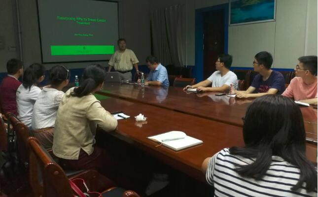 肿瘤是目前威胁人类生命健康的疾病之一,而肿瘤化疗的多药耐药一直是治疗的难点,以张建亭教授为首的研究队伍在美国印第安纳大学医学院Walther肿瘤中心对肿瘤耐药性进行了深入细致的研究和探讨。此次报告中,张建亭教授介绍了肿瘤形成的机制及人体对抗癌药物的耐药性,通过耐药相关蛋白分析和高通量化学药物筛选等方法发现乳腺癌患者体内脂肪酸合成酶(FASN)的表达越高,机体的耐药性越强。张教授带领的团队利用FDA批准的药物数据库进行计算机筛选,确定了质子泵抑制剂(PPIs)是人类FASN活性的有效抑制剂,为乳腺癌的治疗提供了新的思路和方法。张教授的报告让大家了解了“肿瘤化疗多药耐药”的基本原理、作用机制和前沿研究进展,演讲受到了大家的热烈欢迎。