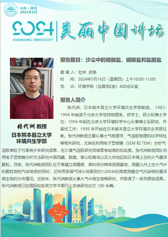 张代洲,日本熊本县立大学环境共生学部教授。 1983-1994 年就读于北京大学地球物理系,获学士、硕士和博士学位;1994 年起在北京大学环境科学中心从事博士后研究,并留校工作;1999 年开始在日本熊本县立大学环境共生学部任教。张代洲教授主要从事大气物理学、气溶胶物理和化学特性等相关研究,尤其在利用电子显微镜(SEM 和 TEM)分析气溶胶单粒子方面有许多研究成果,在沙漠气溶胶研究领域享有较高的知名度。张代洲教授团队利用电子显微镜分析方法研究中国西藏、敦煌、泰山和青岛以及九州地区和日本海上空的大气悬浮颗粒。目前,张代洲教授团队在天草建立高精度、高时间分辨率观测基地,测量九州上空大气中的颗粒物和气体物质的同时,还利用系留气球从地面到约1200米的高度测量空气污染物和悬浮微生物的分布情况。近些年,张代洲教授从事大气中微生物等研究,并取得了一系列原创成果。张代洲教授已在国际知名英文学术期刊上发表研究论文 100 余篇。