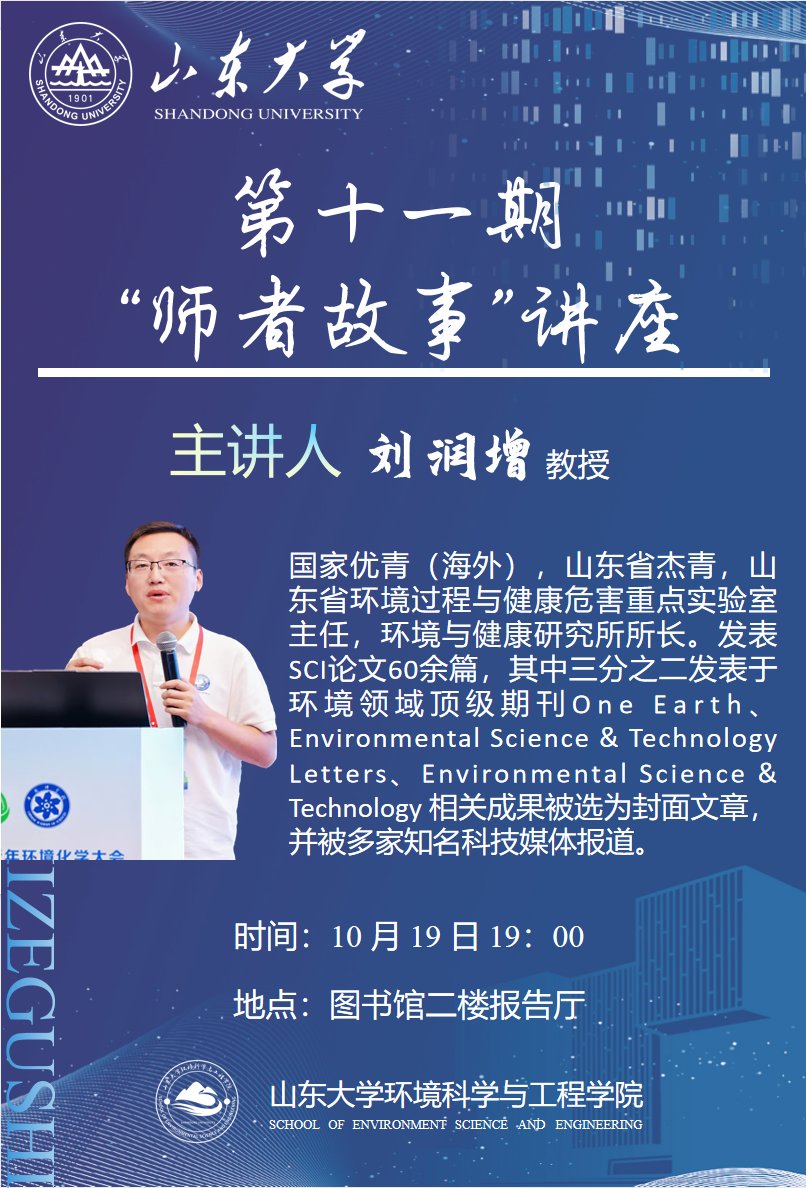 刘润增,教授,博士生导师,国家优青(海外),山东省杰青,山东省环境过程与健康危害重点实验室主任,环境与健康研究所所长。发表SCI论文60余篇,其中三分之二发表于环境领域顶级期刊One Earth、Environmental Science & Technology、Environmental Science & TechnologyLetters。相关成果被选为封面文章,并被多家知名科技媒体报道。