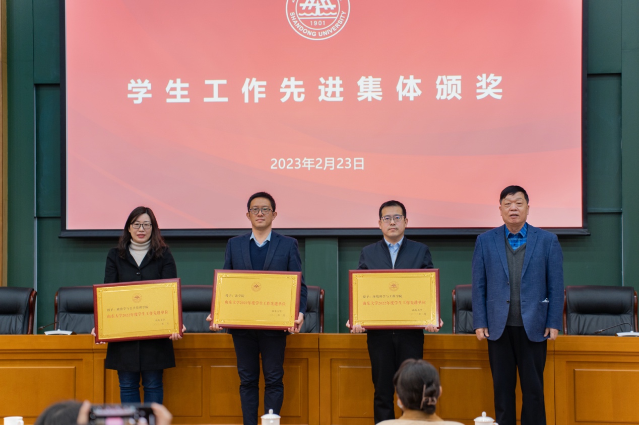 2月23日,山东大学2023年新学期学生工作会议在一校三地同步举行,会议总结2022年学生工作、部署2023年新学期重点任务,同时表彰了2022年度学生工作先进单位。环境学院荣获2022年度“山东大学学生工作先进单位”称号。学院党委副书记桑伟林代表学院上台领奖并作题为“一个核心,两个牵引,做到‘三抓三促’,构建高质量‘优秀环境人’育人体系”的汇报交流。