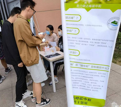 “助力碳达峰碳中和”环保科普主题展活动。为引导学生树立“尊重自然、顺应自然、保护自然”的生态文明理念,践行绿色低碳的生活方式,6月5日,环境学院开展了“助力碳达峰碳中和”环保科普主题展活动。环境学院学生会在一多书院S1东门展开宣传,经过的同学们纷纷被宣讲声和宣传海报所吸引,前来答题。根据展台工作人员的指示,参与同学从问题盒中有序抽出指定题型的三个问题并进行作答。多样有趣的题目提高了同学们的活动参与度和积极性。环保科普主题展活动让同学们了解到现今世界的环境状况,也进一步传递了“碳达峰、碳中和”的理念。