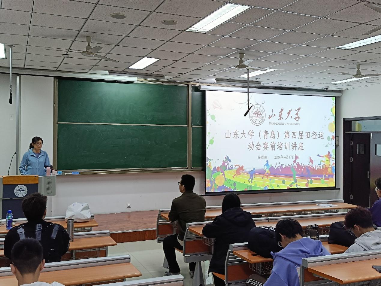 为积极备战山东大学(青岛)第四届全民运动会,激发学子为学院争光的热情,4月18日晚,环境科学与工程学院在振声苑举行运动会赛前动员会暨培训讲座。本次培训邀请了山东大学体育学院谷昭卿老师担任主讲,80余名运动员参加。