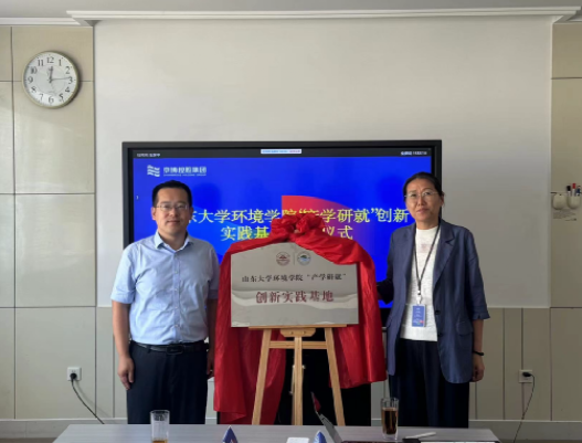魏桥国科高等技术研究院负责人周生银,高端化学材料中心、能源与环境中心分别介绍研究情况与发展规划。王新波教授向企业介绍了环境学院在学科建设和科研方向上的优势,希望通过与魏桥集团的合作,能够在科技创新、人才培养和科研成果转化等方面形成协同效应,推动双方共同发展。双方就校企合作、科研成果转化等方面进行了深入交流,并进行“产学研就”创新实践基地授牌仪式。