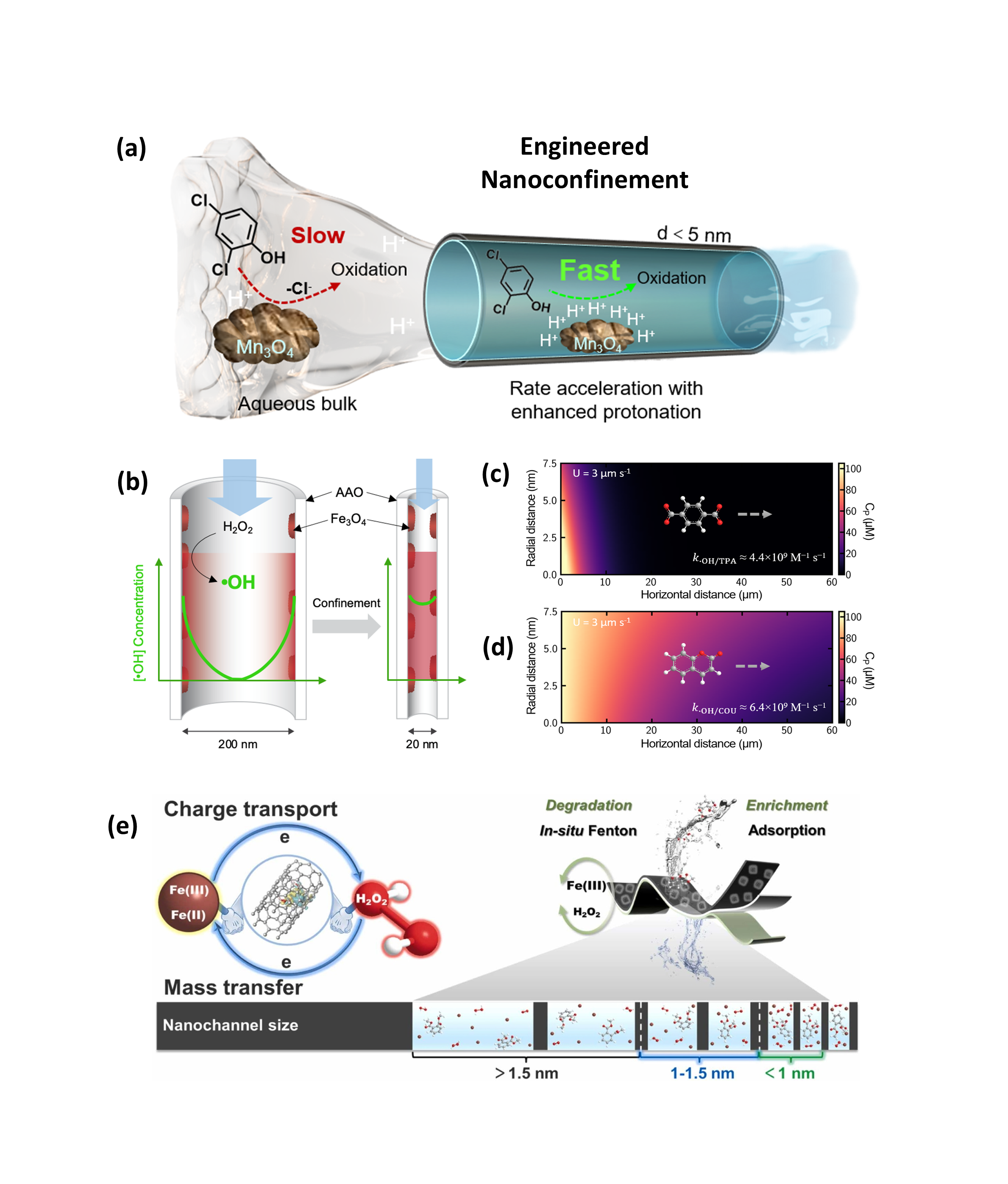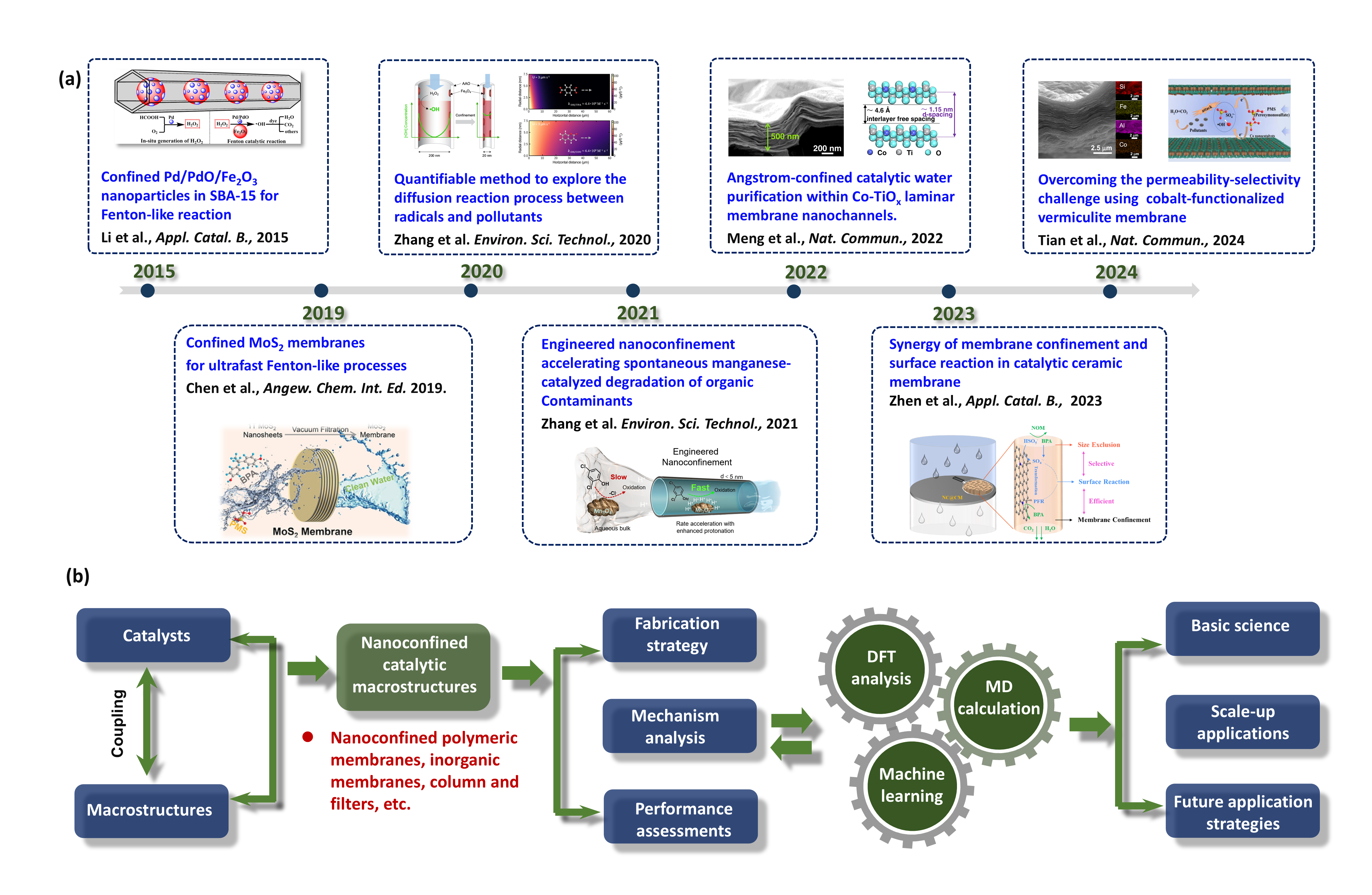 全球经济发展造成的水污染显著加剧了淡水资源的枯竭。因此,循环利用水资源成为可持续管理水资源的重要策略。活性氧(ROS)所具有的较强氧化能力,使得基于纳米催化剂的高级氧化工艺(AOPs)成为该策略的有效实施方案。然而,由于ROS在水中的有限质子转移和极短寿命,该技术应用仍受低活性效率和低自由基利用率的限制,并且受限于粉末催化剂难以回收的难点。近期研究发现,通过将纳米催化剂固定在膜/柱/过滤器上形成各种催化宏观结构可以解决AOPs的困境,其核心原理是控制微污染物、氧化剂分子与催化剂表面之间的纳米尺度距离。相对于均相溶液,利用纳米尺寸空间限域的异相催化宏观结构对有机微污染物的去除性能显著提高。