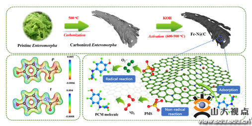 针对上述问题,环境学院2016级本科生陈诚在许醒副教授的具体指导下,以青岛地区夏季常见的浒苔为原料,基于浒苔具有高组分N、Fe元素的特点,制备出绿色、环保、高效的Fe、N共掺杂浒苔基碳材料,并成功构建了一种以浒苔基碳材料为PMS催化剂的新型催化氧化体系。研究表明,该绿色催化剂能够在高盐浓度、较宽的pH范围(3-9)保持极高的稳定性,表现出良好的应用潜能;催化剂中的石墨基N含量与有机污染物去除速率常数呈现出高度的线性正相关性。同时,该研究构建了一种非自由基机制的氧化体系,为新型有机污染物的高效降解提供了新思路。以上研究得到了国家自然科学基金、山东省“泰山学者”和山东大学青年学者未来计划的资助。