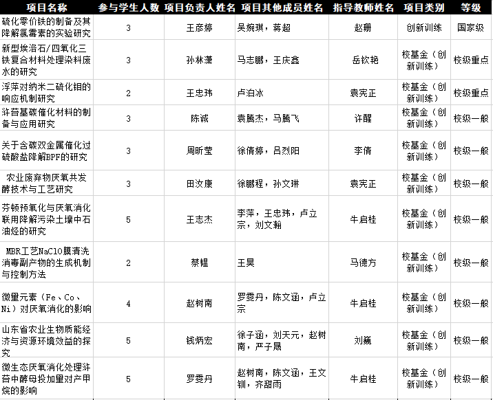 在第十六届“挑战杯”山东大学大学生课外学术科技作品竞赛中,环境学院8项作品获奖,其中,16级本科生倪睿为负责人的团队以《基于多重改性的零价铁系材料合成及其对抗生素类污染物降解效能的溯由研究》项目荣获特等奖。另外,还获得二等奖3项、三等奖4项;在山东大学第十届大学生节能减排社会实践与科技竞赛中,环境学院共有16项作品获奖,其中,17级本科生罗雯丹为负责人的团队以《聚焦节能减排,共筑现代养殖业--关于广西壮族自治区畜禽养殖业粪污资源化利用现状及节能减排收效的探讨与思考》项目获得特等奖。另外,还获得二等奖7项,三等奖5项,优秀奖三项;在2019年国家级大学生创新创业训练计划暨山东大学校级科技创新基金立项评审中,学院共有11个项目获批立项,其中,16级本科生王彦婷为团队负责人的《硫化零价铁的制备及其降解氯霉素的实验研究》项目荣获国家级立项。另外,还获批校级重点项目两个,校级一般项目8个。