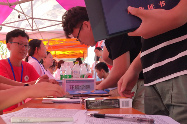 在本次迎新工作中,为方便新生更快速、便捷地办理相关的入学手续,环境学院周密安排了相关的准备工作。由多名研究生、本科生组成的志愿者团队分工明确、尽职尽责,于学生公寓9号楼西侧广场设立展台,进行新生的信息核对、资格审查、档案材料收取、绿色通道办理与物资发放等工作。此外,学院积极发挥学生党员的模范带头作用,设立党员示范岗,随时为新生及家长答疑解惑。