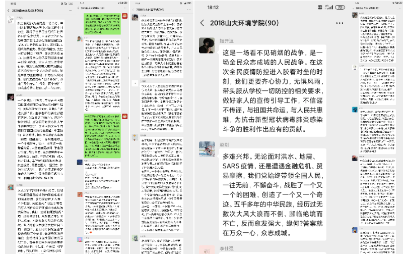 2017级本科生房友帅:在新型冠状病毒肺炎出现以来,中华儿女万众一心,众志成城,每一个感人事迹背后都有着无数的汗水与泪水,激励着我们每一位中国人民,凝聚着属于中华民族的。疫情面前,世界是一个命运共同体,每一位人都需将防控疫情视作责任。从自己做起,从自身的家庭做起,认真防疫!