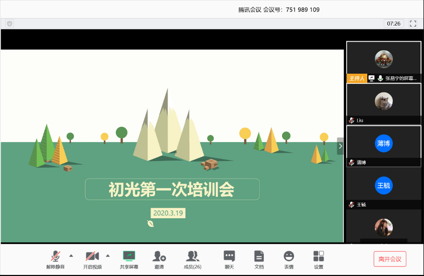 3月19日晚,环境学院“初光”支教团线上培训交流会在腾讯会议平台召开。环境学院辅导员王靖鸥、环境学院本科生刘文瀚、王志杰,2020届“初光”支教团团长张易宁以及支教团全体成员参加会议。会议由张易宁主持。