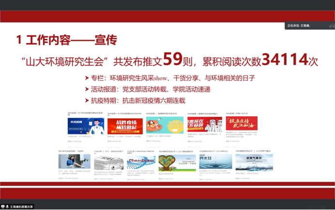 此次会议由年度工作总结与候选人竞选两部分组成。在工作总结中,上一任研会主席王海澜作年度研究生会工作报告,报告总结了过去一学年中研究生会在日常工作、活动举办、宣传工作中取得的成果和进步,同时指出了研会工作中尚存的不足。上一任学生会各部门负责人对一整年的工作分别进行述职,回顾了一年来部门取得的成就和发展,提出了具体的工作感悟和心得。