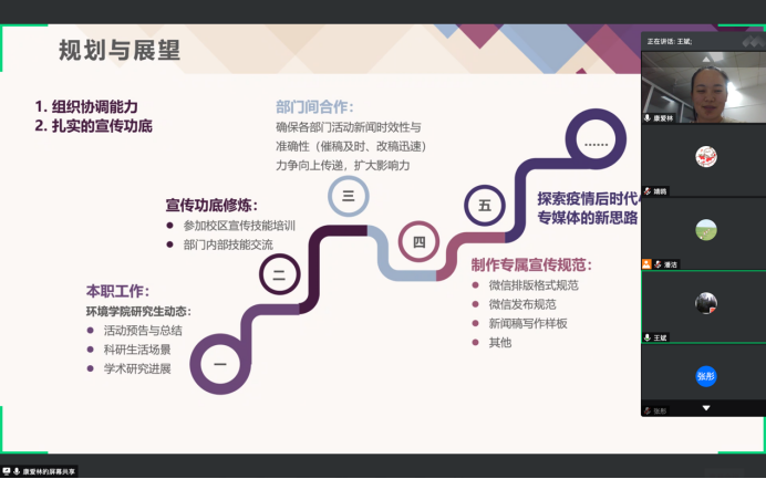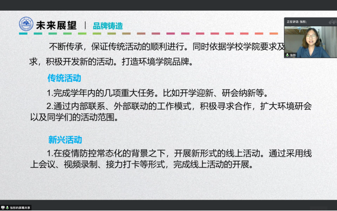 张彤同学从完善制度建设、打造品牌活动、抓住重点节点等几个方面对未来工作提出构想;马雪松同学提出设立“研会信箱”、促进体育活动普及化等工作方式;康爱林同学致力于打造新媒体宣传阵地、完善宣传能力培训的工作思路;张师齐同学提出要从实践活动入手,抓住“世界环境日”等学院特色活动;齐甜雨同学认为要汇集创新创业资源、加强志愿者团队建设。