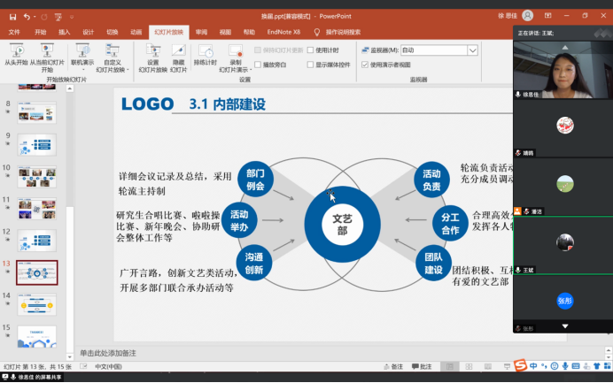 为进一步加强我院学生骨干队伍建设,提升学生干部的服务能力与工作能力,更好的服务学生发展,7月20日与22日,学院通过腾讯会议在线上开展了2019-2020年研究生会、学生会学年总结大会与主席团换届竞选会。学院党委副书记王斌,团委副书记李紫薇,各年级辅导员与上一任主席团全体成员参加了会议。