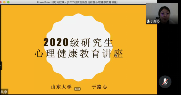 2020年10月19日,为进一步提高学生心理素质,宣传普及心理健康知识,帮助新生及时适应新环境,促进学生身心健康发展,山东大学开展研究生入学教育——心理健康教育。本次教育会议邀请到于路心老师向同学们进行相关知识的科普。受疫情影响,本次会议实行线上模式,共历时1小时10分钟,环境科学与工程学院2020级全体新生均参与到本次会议中。