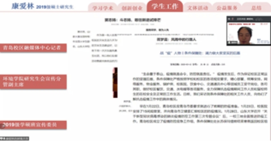 此次参选的学生们风采各异,2019级本科生李培华积极参加文艺活动,在迎新晚会、才艺比赛,年终晚会等活动中唱出青春,在彰显自己的风采的同时,也为学院学生的日常生活增添色彩。2017级本科生赵树南潜心科研,致力学术,积极投身各类科研项目。2018级本科生齐甜雨热衷社会实践工作,在丰富自己社会经历的同时,承担了包括基层教育,走访调研,志愿工作等一系列的社会责任,将自己与社会、与国家紧紧拴在一起。2020级博士生段丕俊在读研期间发表多篇SCI论文,与团队一起研究出多个优秀成果。2019级硕士生康爱林用文字宣传环保,作为一名独立自媒体人在多个平台传播“环境人”的声音。