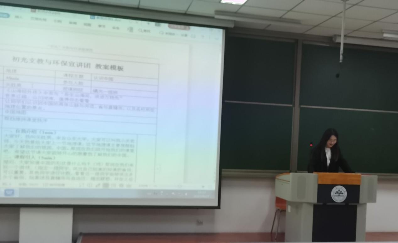 会上,齐甜雨同学主要讲解了线下支教中的课程设置、教案撰写、课程试讲、行前准备等方面的问题。在课程设置方面,齐甜雨同学介绍了“初光”支教与环保宣讲团历来的课程要求,并着重提出教学体系应当多元化,教学内容也应根据实际情况灵活调整;在教案撰写方面,齐甜雨同学向支教团队员们展示了教学反例与教学范例,对队员们的教案撰写提出了相关要求。