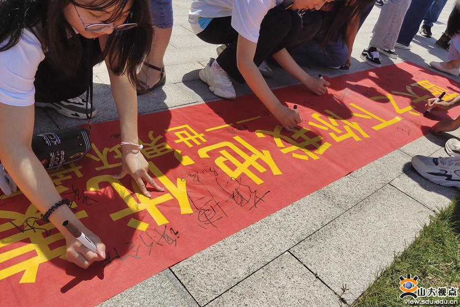 本次活动共分为三个环节。合唱团成员挥动国旗,合唱了歌曲《我和我的祖国》。随后,学生代表宣读了环保倡议书,呼吁同学们从生物保护、垃圾分类、绿色消费、低碳出行等方面保护自然环境,倡导从校园开始,立即行动起来,为建设美好家园作出贡献。活动最后,参与同学纷纷在世界环境日横幅上签下了自己的名字。