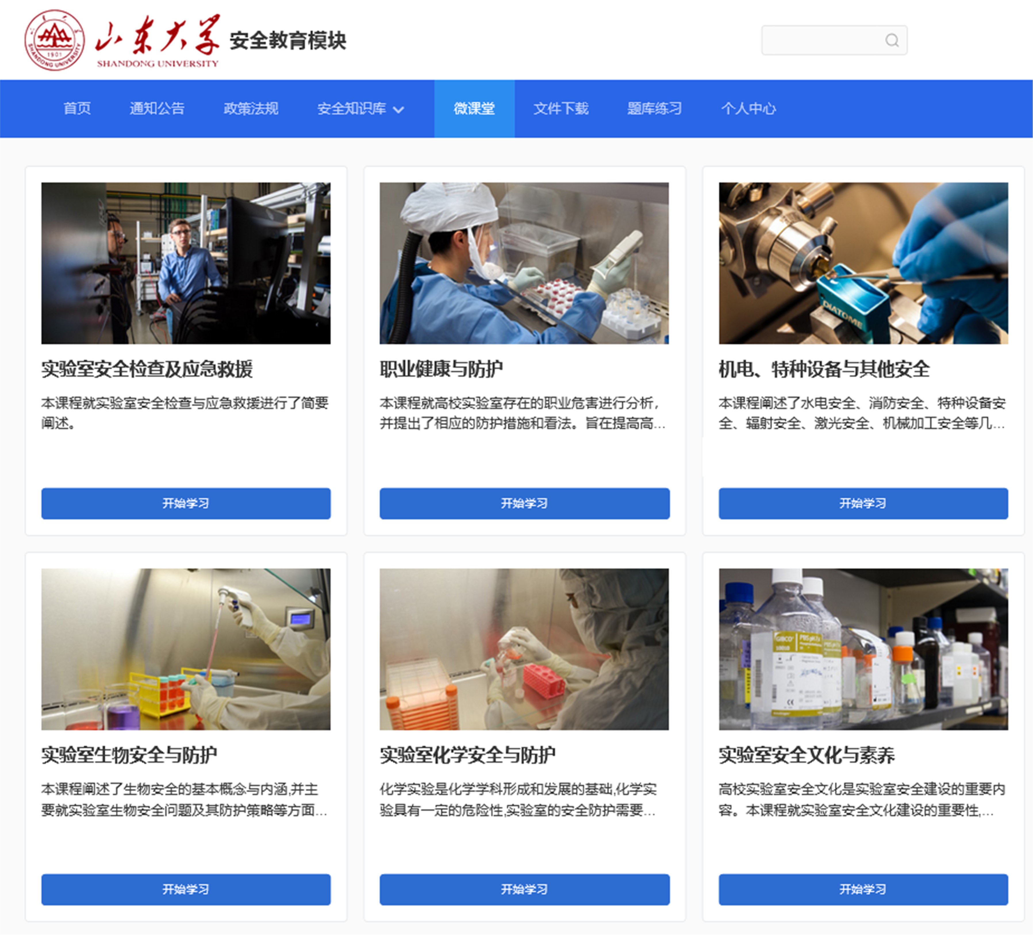 强化宣传教育,提升安全意识。为进一步促进实验室安全工作,加强宣传教育,丰富学习媒介与学习内容,环境学院深度利用学校学习资源,组织师生线上观看学习“山东大学安全教育平台”中的“微课堂”栏目,其内置《实验室安全检查及应急救援》、《职业健康与防护》、《机电、特种设备与其他安全》、《实验室生物安全与防护》、《实验室安全文化与素养》、《高校实验室安全技术概论》等6门课程,并进行有针对性的答疑活动。在此基础上,环境学院在学院一楼举办“实验室安全知识文化展”,展板内容涉及化学品安全、生物安全、水电安全、消防安全、特种设备安全、辐射安全、一般设备安全、通识安全等多个方面,向大家详细介绍实验室安全知识。