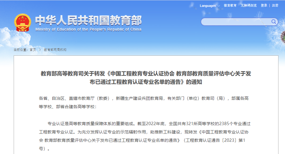 近日,教育部高等教育司发布了关于转发《中国工程教育专业认证协会教育部教育质量评估中心关于发布已通过工程教育认证专业名单的通告》(工程教育认证通告〔2023〕第1号)的通知。在学校、学校相关职能部门和相关学院的大力支持下,环境科学与工程学院上下同心,全力以赴,攻坚克难,经过材料准备、学校自评、自评审核、专家组现场考查、结论审议等程序,我校环境工程专业顺利通过认证、认证有效期为6年。