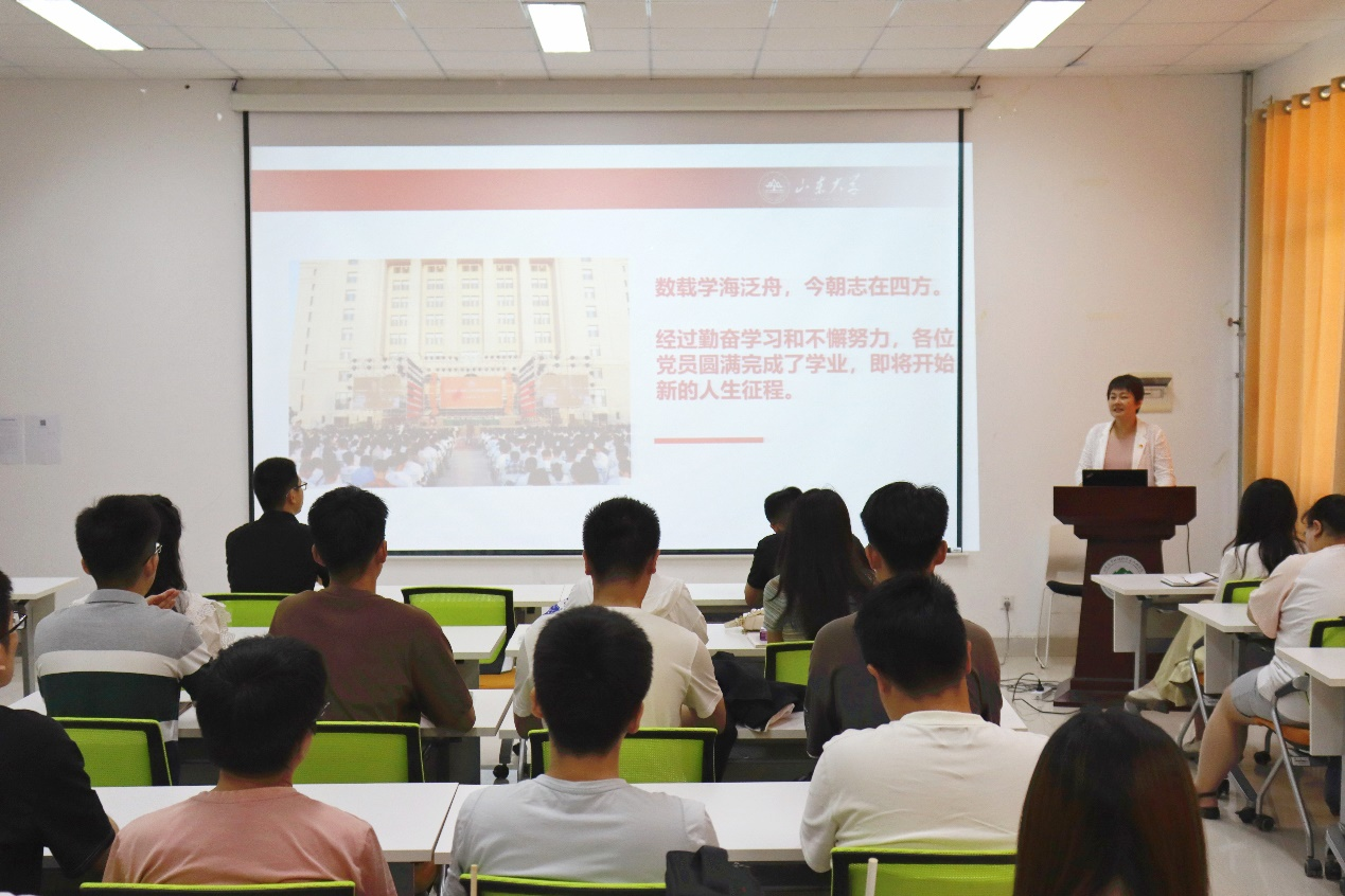 毕业专题党课,坚定理想信念。环境学院党委书记刘健以“青春奋进心向党,砥砺前行建新功”为主题为毕业生党员上了离校前最后一次党课。她对毕业生党员提出殷切希望,希望大家牢记初心使命,贡献青年力量,坚定不移听党话、跟党走,勇做推进中国式现代化的奋进者、开拓者、奉献者,怀抱梦想又脚踏实地,努力成为堪当民族复兴重任的时代新人;希望大家秉承山大精神,坚定理想信念,学无境之道,扬浩然之气,在与新时代同向同行的奋进征程中,做有志气、有骨气、有底气的山大学子;希望大家发挥示范作用,践行文明离校,做好党组织关系转接工作,妥善办理好各项离校手续,乐于奉献,传承经验,增强服务意识,发挥党员模范带头作用。