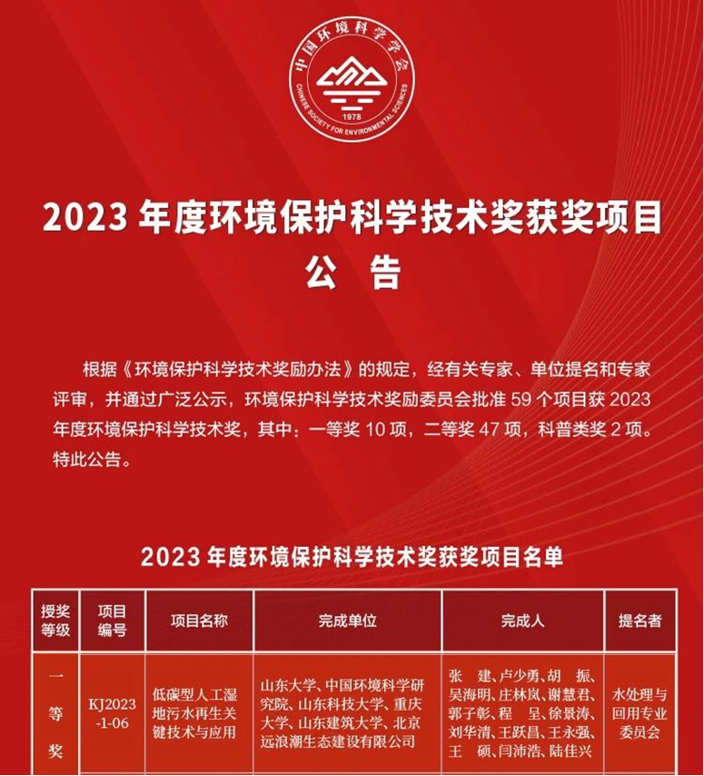 近日,中国环境科学学会公布了2023年度环境保护科学技术奖获奖名单,由山东大学牵头,联合中国环境科学研究院、山东科技大学、重庆大学、山东建筑大学、北京远浪潮生态建设有限公司申报的“低碳型人工湿地污水再生关键技术与应用”荣获2023年度环境保护科学技术奖一等奖。