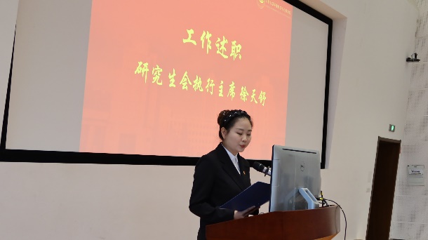 兼职团委副书记黄诗萌、第五届学生会主席刘厶旖、第二十二届研究生会执行主席徐天舒分别做述职报告。报告首先回顾了过去一年所做的工作及取得的成就,并对科创比赛、文体活动、志愿服务等几个重点工作进行了总结,并提请大会代表审议。