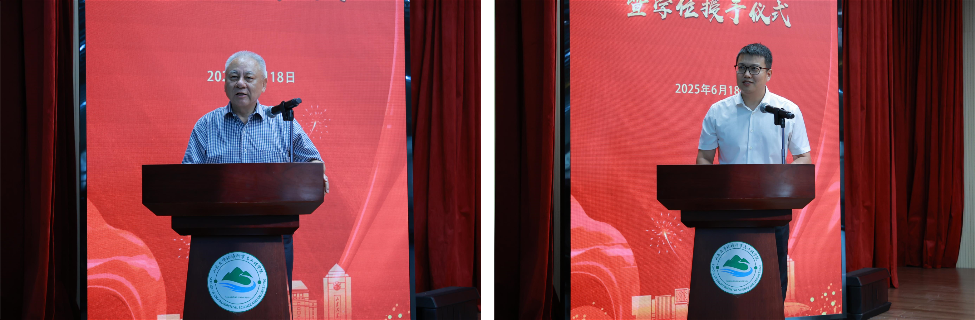 在庄严的中华人民共和国国歌《义勇军进行曲》声中,毕业典礼暨学位授予仪式拉开帷幕。刘春光宣读优秀毕业生表彰决定,宋作标为优秀毕业生代表颁发证书,赠送毕业礼物。蒲业虹宣读聘任2025届校友班级理事决定,胡振为校友班级理事颁发聘书。
