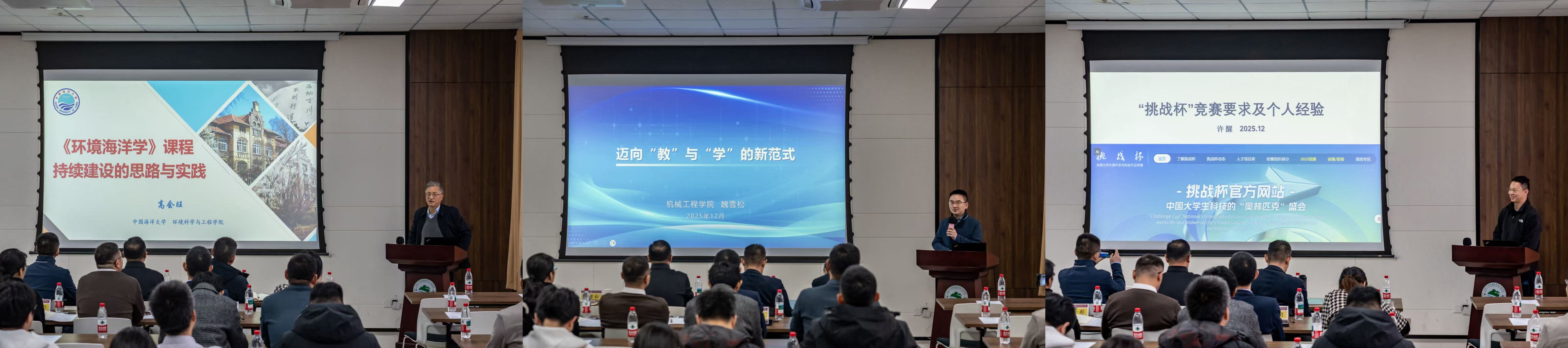 高会旺以“‘环境海洋学’课程持续建设思路与实践”为题,分享了多年来的课程建设经验与创新实践,强调课程设计应紧跟学科前沿,注重理论与实践的结合。魏雪松在“迈向‘教’与‘学’的新范式”报告中提出,鼓励教师积极参加各类教学比赛,以赛促教,将比赛视为展示教学创新成果、交流先进方法、提升育人水平的重要平台。许醒教授以“‘挑战杯’竞赛要求及个人经验”为题,分析了竞赛对学生创新能力培养的重要意义,并提出了宝贵的备赛策略与团队建设技巧。副院长胡振作了“环境学院一流本科专业建设现状与瓶颈分析”的报告,系统梳理了学院专业建设的成果与面临的挑战。院长助理常景彩汇报了环境学院本科教学管理制度体系构建情况,强调了制度保障在提升教学质量中的基础性和指导性作用。党委副书记高正在“守正创新久久为功—合力谱写环境学院学风建设新篇章”的发言中,展示了学院学风建设开展工作及成效,呼吁全院师生共同努力,营造严谨治学的学习氛围。