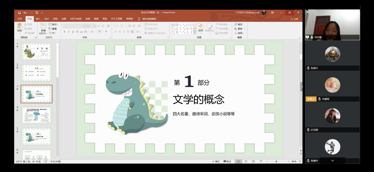 由于疫情的影响,五组试讲同学将战场转移至线上,灵活运用网络工具,以“屏幕共享”加“视频”的形式,声情并茂地完成了线上试讲任务,较好的模拟了支教时的场景。生动简明的ppt、亲和有趣的互动、穿插在课堂中的小故事和小视频,让课堂完全摆脱了枯燥的难点。试讲同学在主题选择上也下了很大功夫:有儒雅的诗词、文学;有科普向的数学家故事、野生动物;也有锻炼动手能力的手工。授课内容非常贴合学生的胃口,有助于激发小朋友们的学习兴趣。
